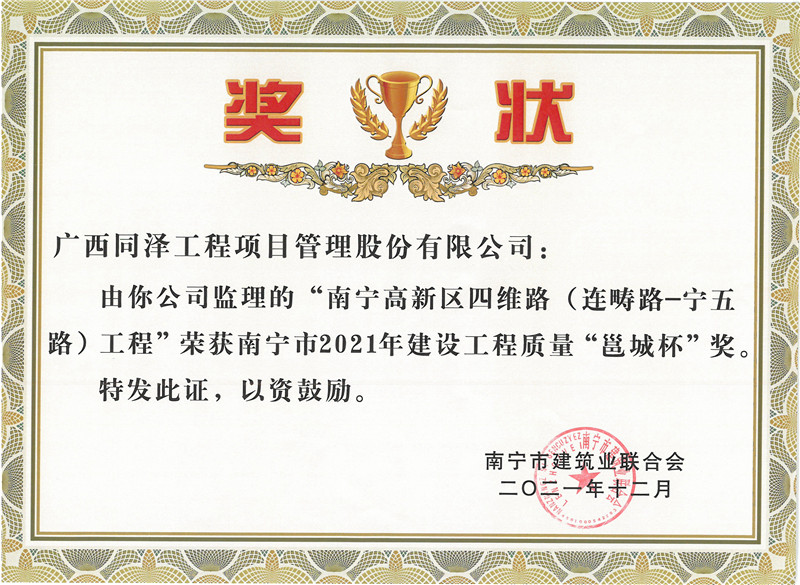 南寧高新區(qū)四維路(連疇路-寧五路)工程榮獲南寧市2021年建設(shè)工程質(zhì)量“邕城杯”獎