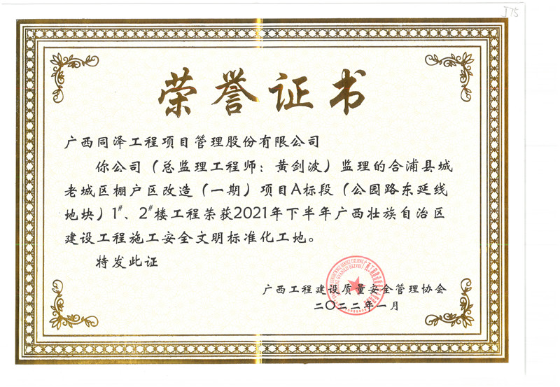 合浦縣城老城區(qū)棚戶區(qū)改造(一期)項目A標(biāo)段項目榮獲2021年(下半年)廣西壯族自治區(qū)建設(shè)工程施工安全文明標(biāo)準(zhǔn)化工地